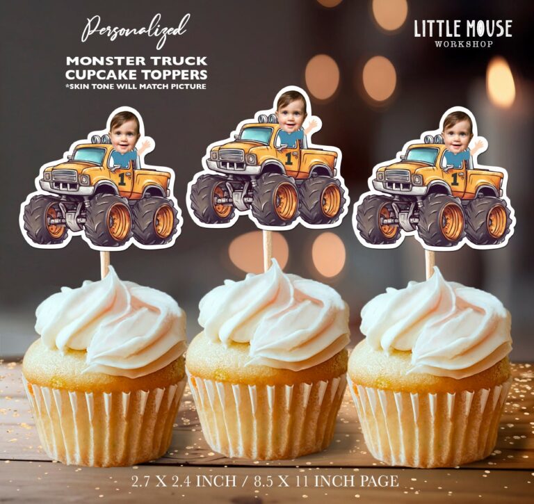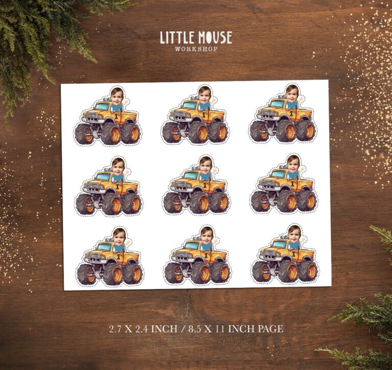 Rev up the excitement for your little one's milestone celebration with these high-energy, personalized vehicle decorations. Designed specifically for a "Big One" or first birthday theme, this digital design features a rugged orange pickup with massive off-road tires and the number "1" displayed prominently on the door. The standout feature is the ability to place your toddler's smiling face directly in the driver's cabin, complete with an illustrated arm waving enthusiastically to guests. These 2.7 x 2.4-inch cutouts are perfectly sized for standard cupcakes or larger treats, offering a professional and custom look for your dessert table. By integrating your child's photo into this dynamic monster truck scene, you create a memorable focal point that celebrates their personality and love for big wheels.