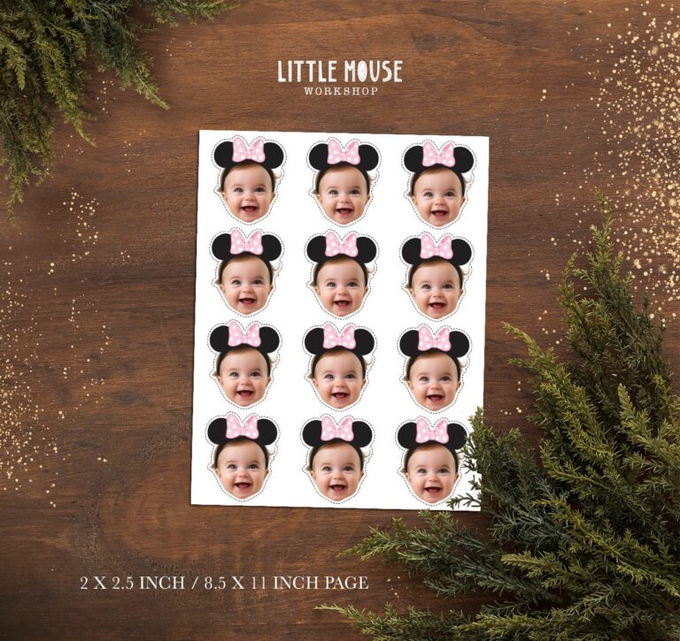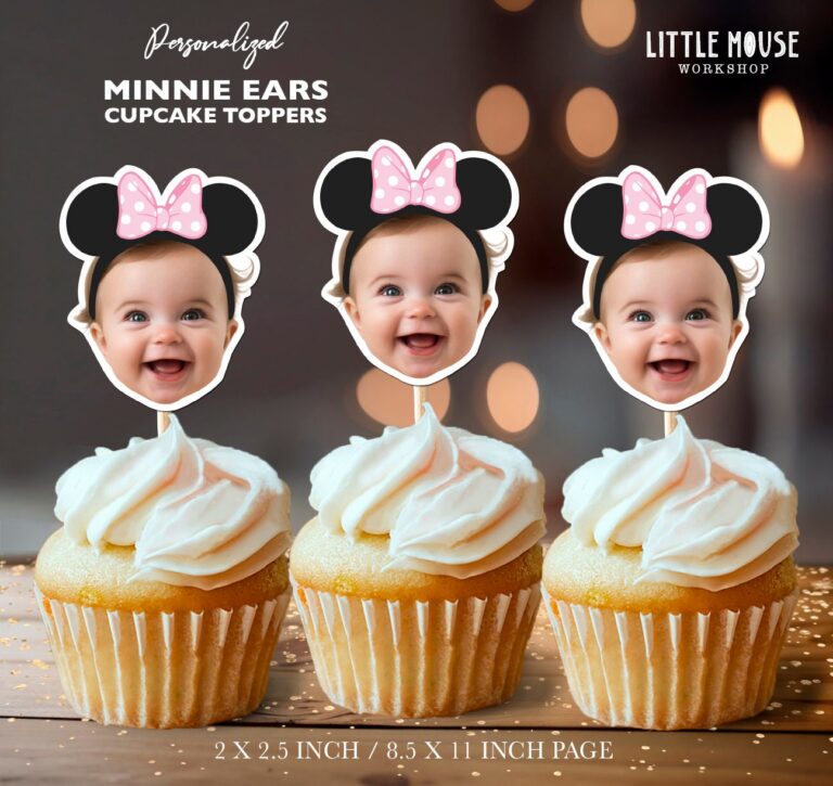 Elevate your little girl's birthday celebration with these professionally designed custom face cupcake toppers, featuring iconic black mouse ears and a classic pink polka dot bow. Ideal for first birthdays, "Oh Twodles" events, or charming baby showers, these printable decorations seamlessly integrate your baby’s smiling photo into the party theme. We meticulously crop and edit your provided image to ensure the ears sit perfectly on your child's head, delivering a polished and high-quality aesthetic. Sized at approximately 2 x 2.5 inches and formatted on a standard 8.5 x 11-inch sheet, these digital files are optimized for easy DIY printing and cutting. Whether adorning frosted cupcakes or accenting a dessert buffet, these personalized toppers provide a unique, heartwarming touch that guests will adore.