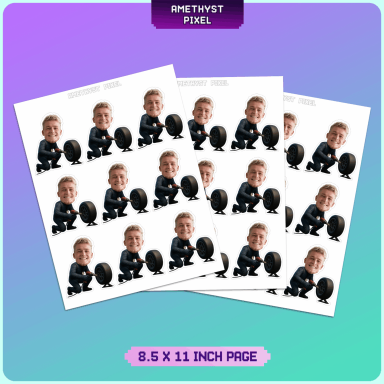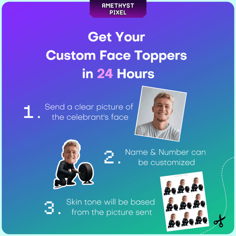 Rev up the excitement at your next racing-themed event with these custom face pit crew mechanic cupcake toppers. This action-packed design features a mechanic in a racing jumpsuit kneeling to change a tire with a pneumatic impact wrench, turning your guest of honor into the hero of the pit lane. Perfect for car enthusiasts of all agesāfrom toddler "Two Fast" birthdays to adult Formula 1 viewing partiesāthis printable decoration adds a personalized touch to your dessert table. As a digital download, you receive a high-resolution file ready for printing at home. We professionally crop your uploaded photo and adjust the neck skin tone to blend seamlessly with the character, ensuring a hilarious and professional finish.