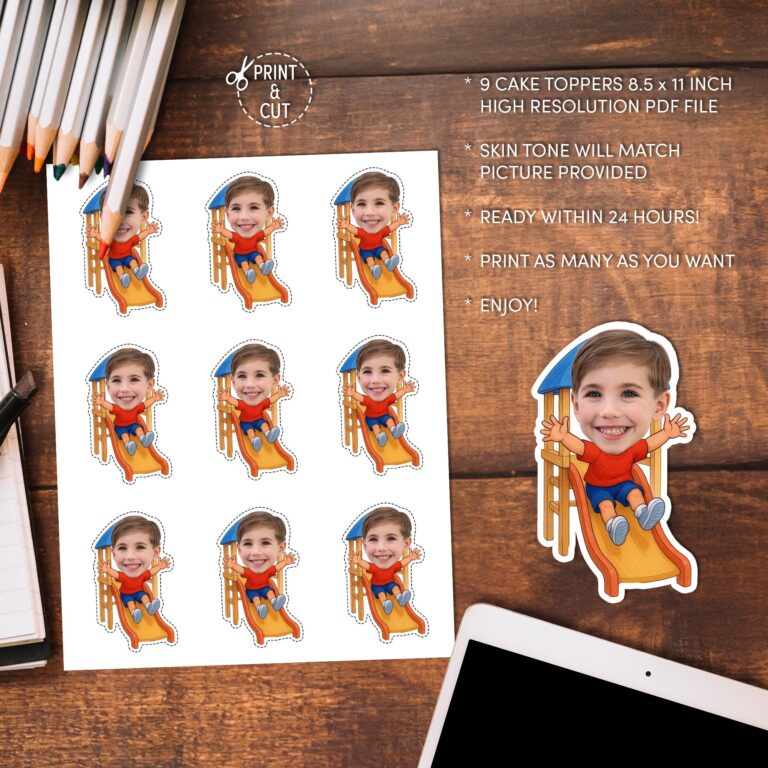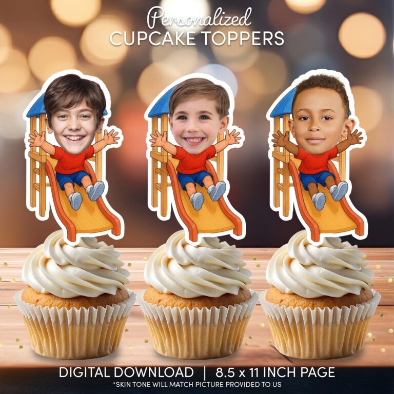 Bring the excitement of a sunny day at the park to your dessert table with these adorable custom playground slide cupcake toppers. Perfect for toddlers and young children who love to play, this design features your child's photo superimposed onto a cheerful cartoon body zooming down a colorful slide in a red shirt and blue shorts. A unique feature of this design is that the skin tone on the cartoon limbs is adjusted to match the photo you provide, creating a seamless and personalized look. Since this is a digital download, you receive a high-resolution file ready for printing at home, ensuring you have the perfect decor for your park-themed event or school celebration.