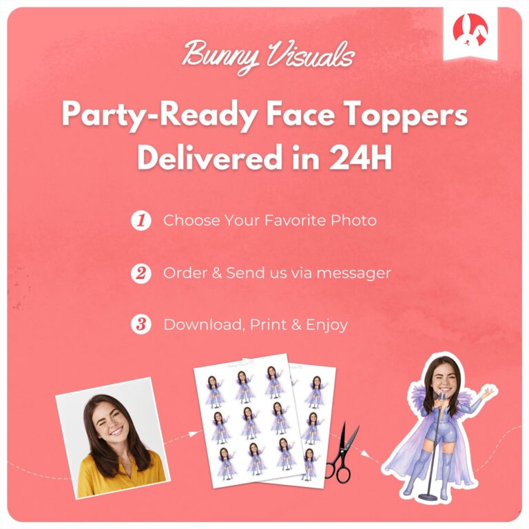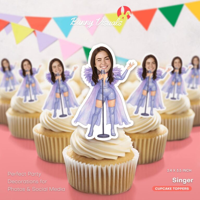 Transform your dessert table into a main stage event with these dazzling custom face cupcake toppers. Designed for music lovers and pop culture enthusiasts, this specific design features a glamorous illustration of a singer in a sparkling purple bodysuit, knee-high boots, and a flowing sheer cape, holding a microphone stand with confidence. Perfect for teens and adults celebrating a milestone birthday or a bachelorette weekend, these printable decorations allow you to feature the guest of honor as the ultimate diva. Standing at approximately 3.5 inches tall, these toppers create an immediate visual impact, turning standard cupcakes into photo-ready tributes that capture the excitement of a stadium concert atmosphere.