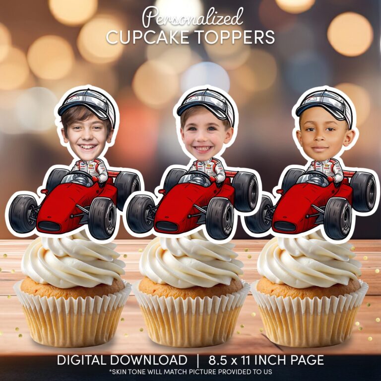 Personalized Race Car Driver Face Cupcake Toppers – Custom Racing Birthday Party Decor