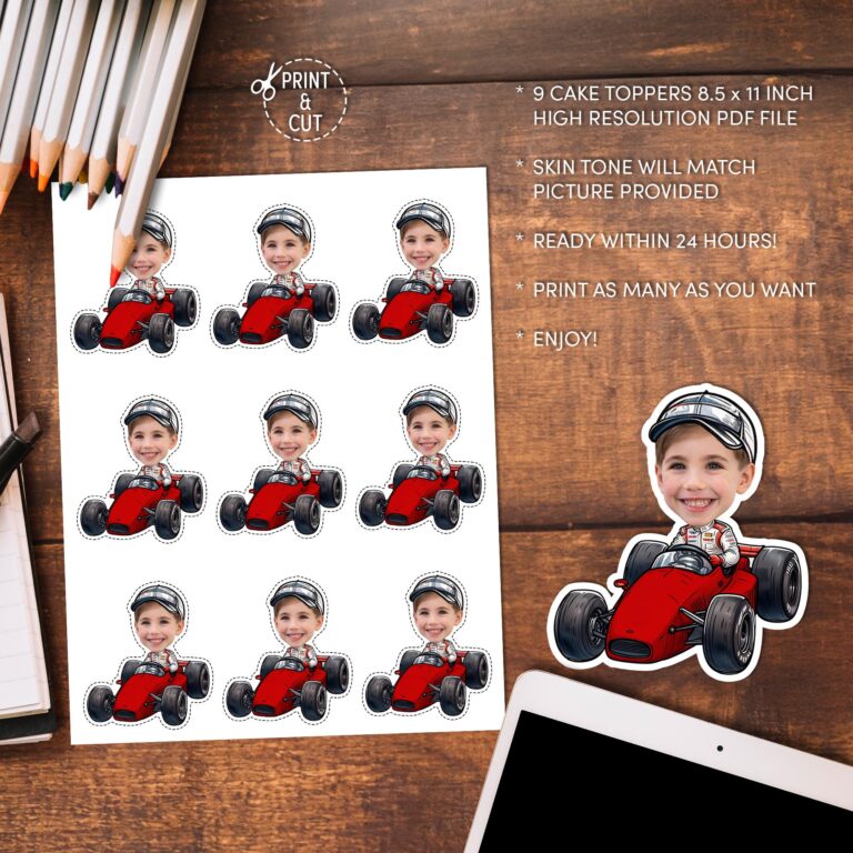 Rev up the excitement at your little one's celebration with these personalized race car cupcake toppers, featuring your child as the star driver. Designed for high-speed themes like "Two Fast" or Grand Prix birthdays, this digital design showcases a classic red open-wheel formula racer with a professional white racing suit. Best suited for toddlers and young children aged 1 to 8 who dream of the racetrack, these toppers add a hilarious and heartwarming touch to the dessert table. As a digital download, you receive a print-ready file after we carefully edit your submitted photo to match the driver's body. For the most realistic look, we recommend using a high-quality, front-facing photo so the face blends seamlessly with the illustration, ensuring a podium-worthy finish for your party treats.