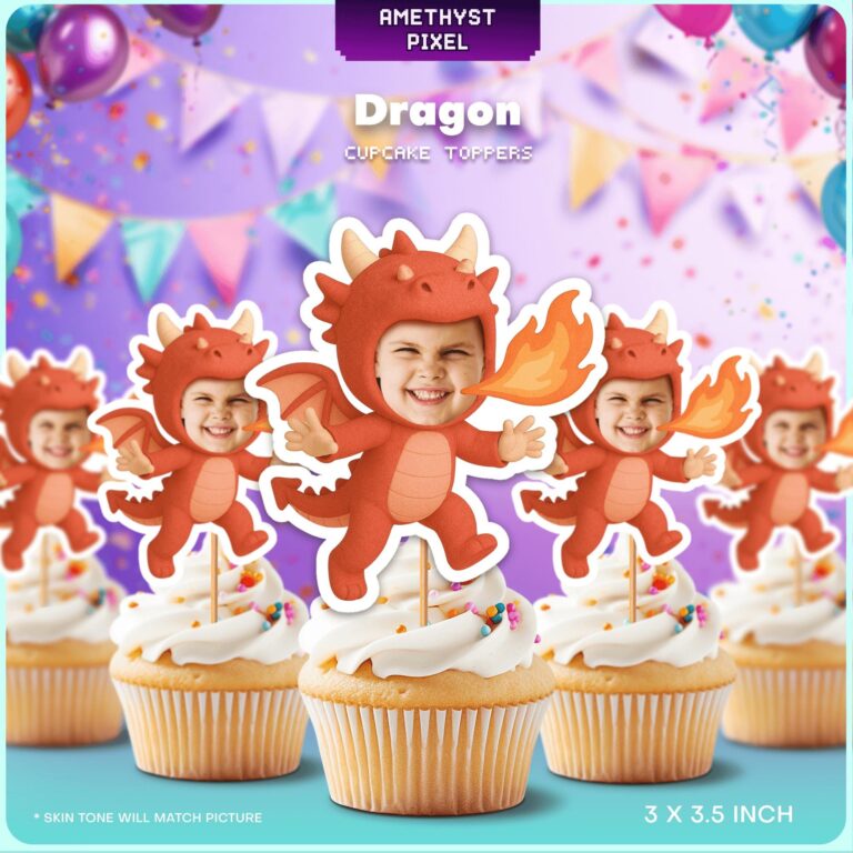 Ignite the fun at your next celebration by transforming the birthday boy or girl into a mythical creature with these Personalized Red Dragon Cupcake Toppers. Expertly designed to feature your child’s photo inside a chubby red dragon costume, this specific cutout includes charming details like playful wings, white horns, and a cartoonish burst of fire. Ideally suited for toddlers and young children, these decorations measure 3 x 3.5 inches, offering the perfect scale for standard frosted cupcakes. Whether you are planning a medieval fantasy event or a cute monster bash, these high-quality, custom-made toppers provide a memorable and humorous focal point for your dessert table, ensuring your party hosting looks professional and cohesive.