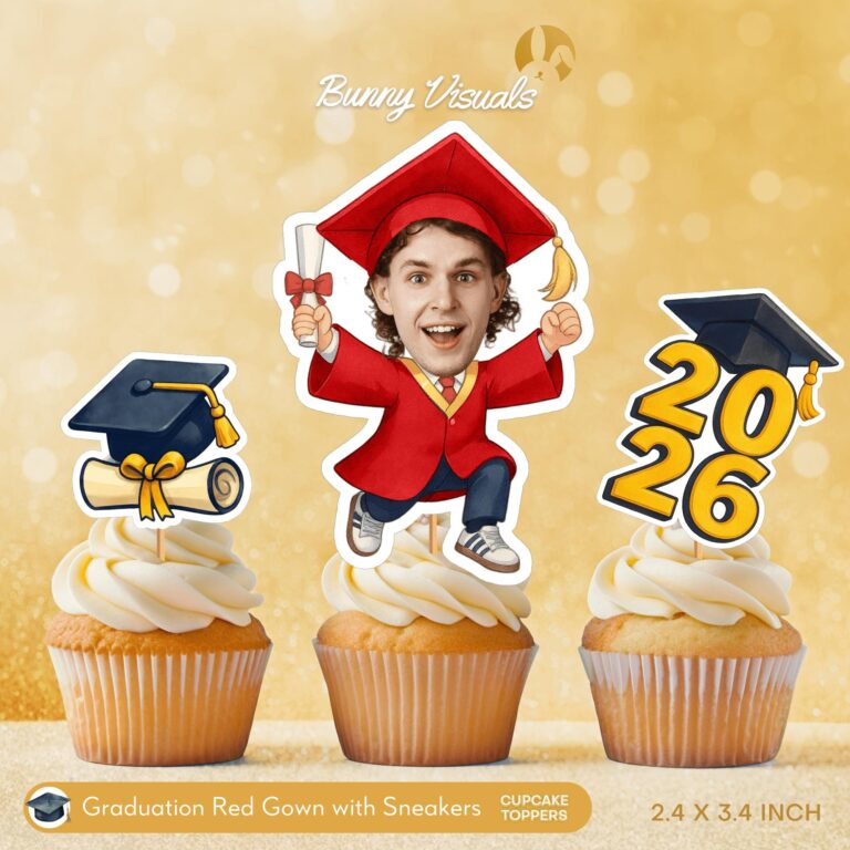 Commemorate a significant academic achievement with these distinctively personalized custom face graduation cupcake toppers. Designed to capture the excitement of commencement, each topper showcases the graduate's photo superimposed onto a cartoon body wearing a bright red mortarboard and gown, energetically jumping with a diploma in hand. These decorations are particularly effective for high school or college graduation parties where school colors include red, adding a bespoke element to the festivities. Beyond their massive visual appeal, these toppers serve as excellent conversation starters for bustling open houses and celebratory family luncheons. The inclusion of the '2026' year marker adds a timely, specific touch, ensuring your dessert styling feels current and professionally curated. Whether used on cupcakes, donuts, or savory appetizers, they provide a polished look that elevates standard party refreshments into memorable centerpieces.