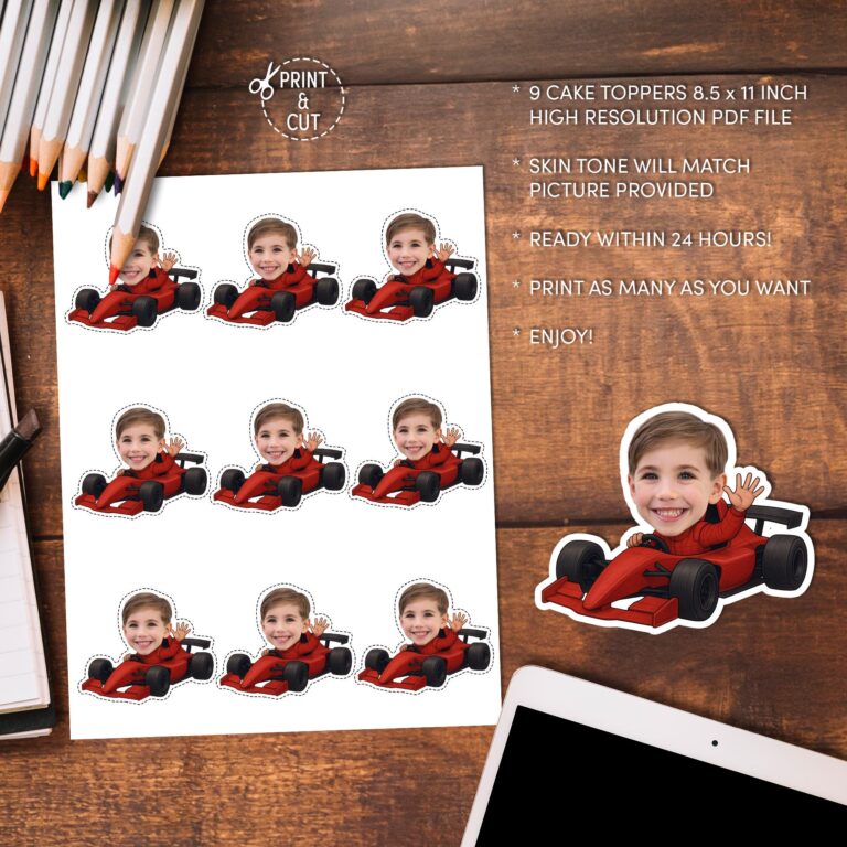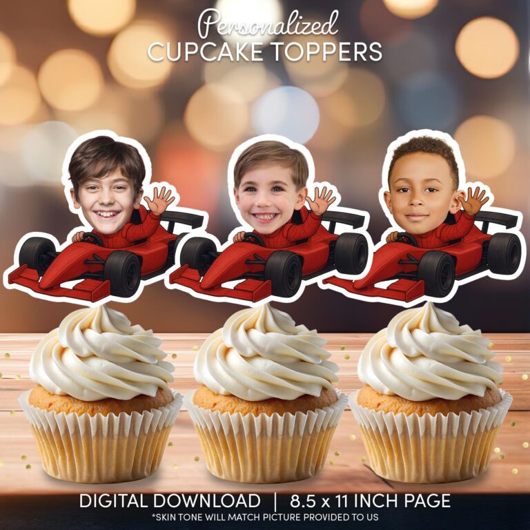 Rev up the excitement at your next event with these personalized race car cupcake toppers featuring the guest of honor right in the driver's seat. Designed for racing enthusiasts, this digital download transforms your provided photo into a fun, custom decoration where the birthday child is depicted driving a speedy red formula-style race car while waving to the crowd. Ideally suited for children aged 3 to 10 who love fast vehicles, these printable toppers make a memorable addition to any pit stop dessert table. The design features vibrant red hues and sharp details that print beautifully on white cardstock. Simply print the high-resolution file at home, cut around the outline, and assemble for a high-speed finish to your party planning.