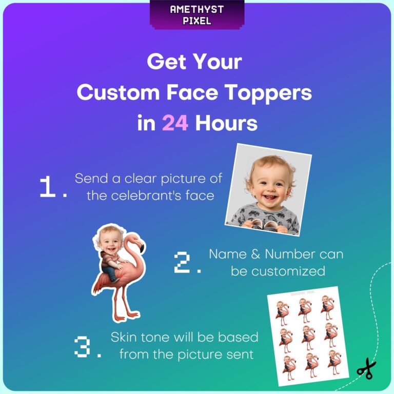 Bring a splash of summer fun to your dessert table with these custom face flamingo cupcake toppers, featuring your child joyfully riding on the back of a pink flamingo. Perfectly sized at 2.3 x 3.7 inches, these printable decorations are ideal for a "Let's Flamingle" first birthday, a toddler's pool party, or a whimsical tropical baby shower. By integrating your provided photo onto the illustrated body, we create a seamless and amusing centerpiece that captures the joyous spirit of island-themed celebrations. These high-resolution digital files ensure professional-quality prints from home, allowing you to create unlimited accents for cupcakes, muffins, or even savory finger foods. Expertly designed to highlight the playful bond between the child and the bird, these toppers serve as a memorable conversation starter for guests of all ages.