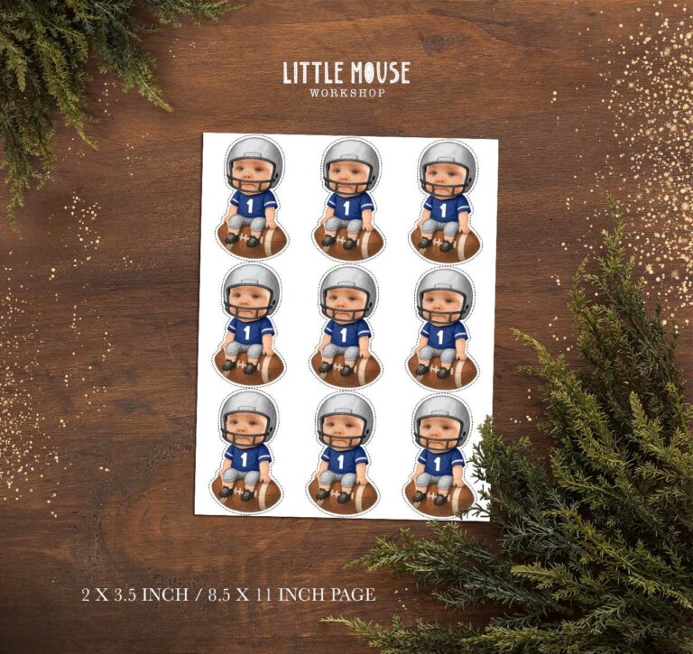 Celebrate your little MVP’s biggest milestone with these expertly crafted custom face football cupcake toppers, specifically designed for a first birthday event. This adorable design depicts a baby boy geared up for his rookie debut, wearing a silver helmet and a blue jersey featuring the number one, while sitting atop a classic pigskin football. Perfect for parents planning a "First Year Down" theme or a general gridiron sports party, these printable decorations transform standard cupcakes into conversation-starting centerpieces. By integrating your child's photo into this professional illustration, you create a cohesive and memorable party aesthetic that highlights the excitement of their first year. Simply print, cut, and assemble for a high-quality, personalized touch to your dessert table.
