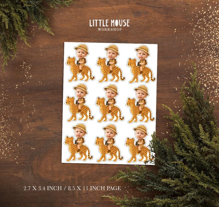 Embark on a wild adventure specifically designed for your toddler's big day with these Custom Face Safari Cheetah Cupcake Toppers. Perfect for a "Wild One" or "Two Wild" celebration, this design features your child's smiling face seamlessly integrated onto the body of a brave little explorer riding a spotted cheetah. The illustration showcases expert attention to detail, outfitting the character in a traditional khaki safari suit, rugged boots, and a classic pith helmet while holding binoculars. Each topper measures approximately 2.7 by 3.4 inches, making them the ideal proportion for standard cupcakes or decorative food picks. These high-quality printable files ensure you receive a sharp, professional finish for your DIY party planning, adding a personalized and humorous touch to your jungle-themed dessert table.