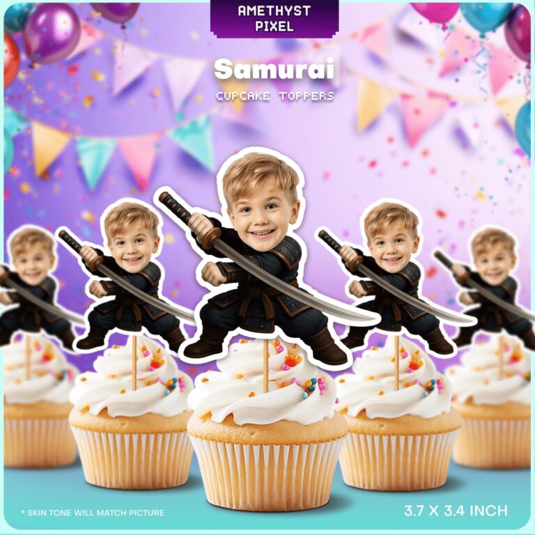 Transform your child's dessert table into scenes from a legendary dojo with these personalized samurai warrior cupcake toppers. Designed specifically for young boys who dream of mastering martial arts, this custom decoration features your little one's face professionally edited onto a fierce swordsman clad in traditional dark plated armor, wielding a silver katana. Measuring approximately 3.7 x 3.4 inches, these toppers are substantial enough to serve as bold centerpieces for cupcakes or even small cake decorations. Perfect for boys aged 4 to 10 celebrating a ninja, karate, or Japanese history-themed birthday, these high-resolution printables ensure your party photos are unforgettable. We focus on expert cropping and high-quality design to make your child the hero of their own warrior saga, delivering a trustworthy and easy DIY party experience.