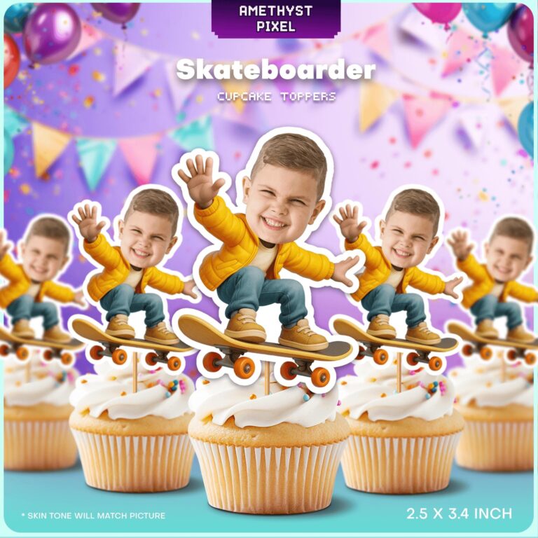 Custom Face Skateboarder Theme Cupcake Toppers for Action-Packed Kids Parties