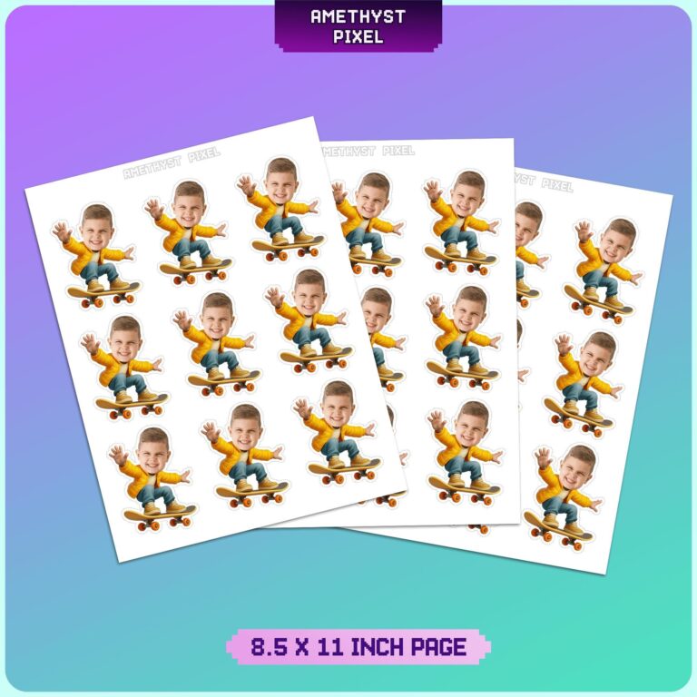 Ramp up the excitement at your next event with these professionally designed custom face skateboarder cupcake toppers, perfect for energetic boys and thrill-seeking kids. The vivid illustration captures a young skater mid-air, decked out in a trendy yellow puffer jacket and denim jeans, surfing a skateboard with bold orange wheels. By seamlessly editing your child's photo onto this dynamic figure, we create a humorous and high-quality centerpiece that anchors your skateboarding birthday theme. As a premium digital printable, this product ensures sharp resolution and vibrant colors, allowing you to create expert-level party decor right from home. These personalized cutouts are essential for parents seeking unique, trustworthy, and memorable details for an urban or extreme sports-themed celebration.