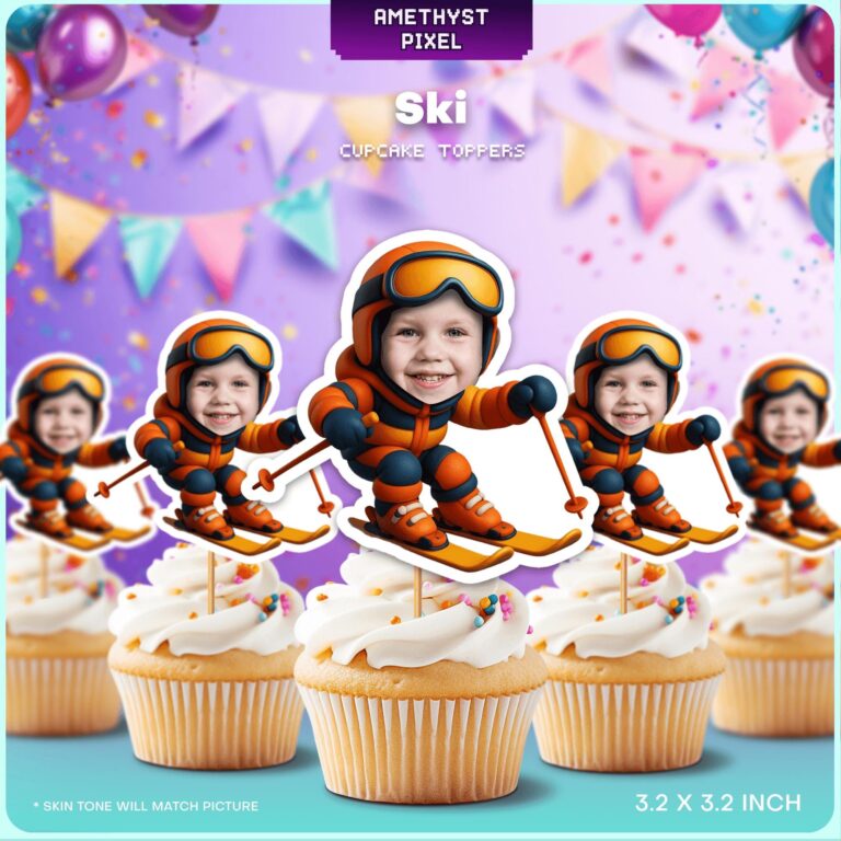 Bring the thrill of the slopes directly to your dessert table with these expertly designed custom face ski cupcake toppers. Perfect for adventurous toddlers and young children, each topper features a vibrant orange and navy blue snowsuit, protective goggles, and professional ski gear, capturing the essence of a fun day on the mountain. By simply adding your childâs photo, you transform them into a little skier gliding through fresh powder, creating a hilarious and memorable focal point for any winter-themed celebration. Ideal for 'Winter Onederland' events, ski lodge gatherings, or marking a first trip to the snow, these high-quality printable decorations measure approximately 3.2 inches, ensuring they stand out beautifully on standard cupcakes or muffins.