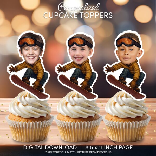 Custom Face Snowboarding Cupcake Toppers â Personalized Winter Sports Party DĂ©cor