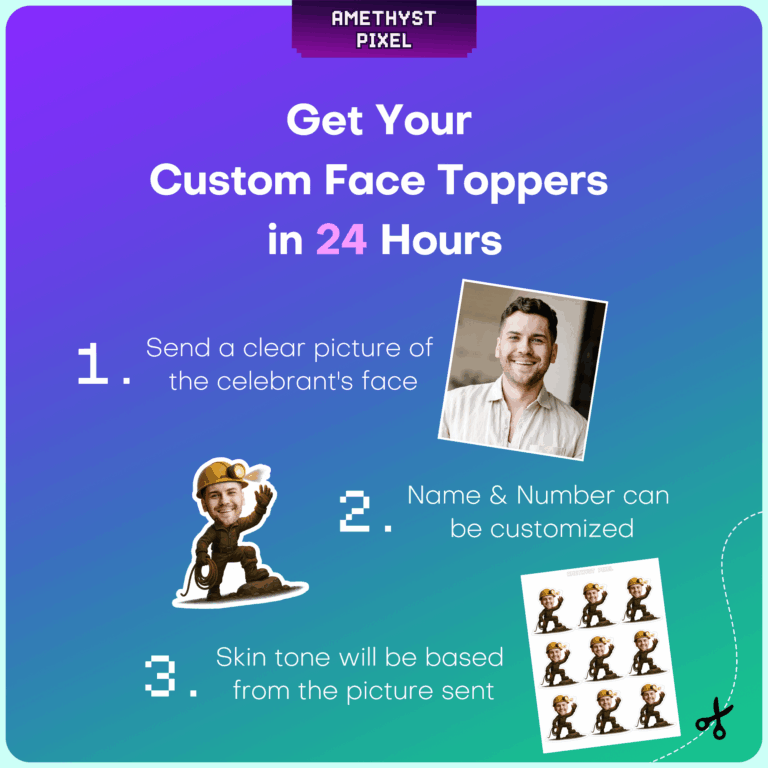 Gear up for an underground adventure with these custom face Spelunker cupcake toppers! Perfect for intrepid explorers of all ages, from curious kids to adult cave diving enthusiasts, this printable design transforms your guest of honor into a brave caver. The design features a detailed exploration jumpsuit, a safety helmet with a glowing headlamp, and a coil of climbing rope, capturing the excitement of a spelunking expedition. Since this is a digital download product, you can print as many toppers as needed right from home. For the best results, use bright white cardstock to ensure the colors of the outfit and your submitted photo pop against the dessert table spread.