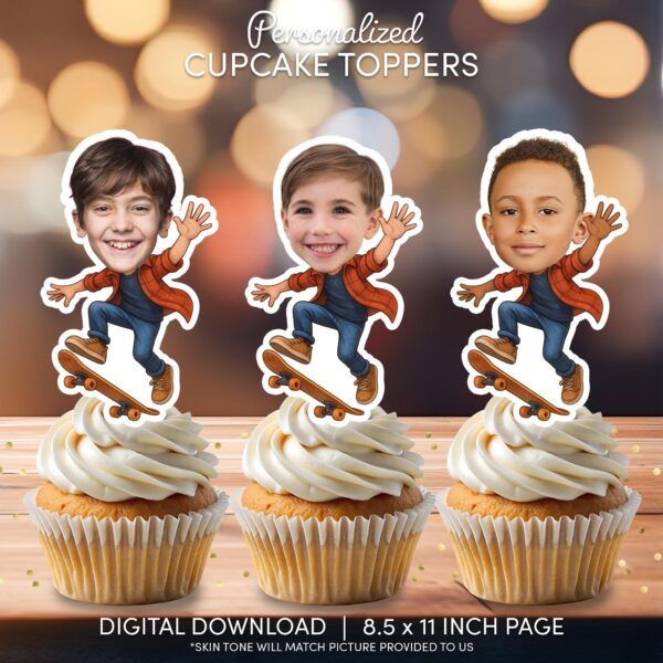 Custom Face Skateboarder Cupcake Toppers - Personalized Skater Boy Birthday Party Printable