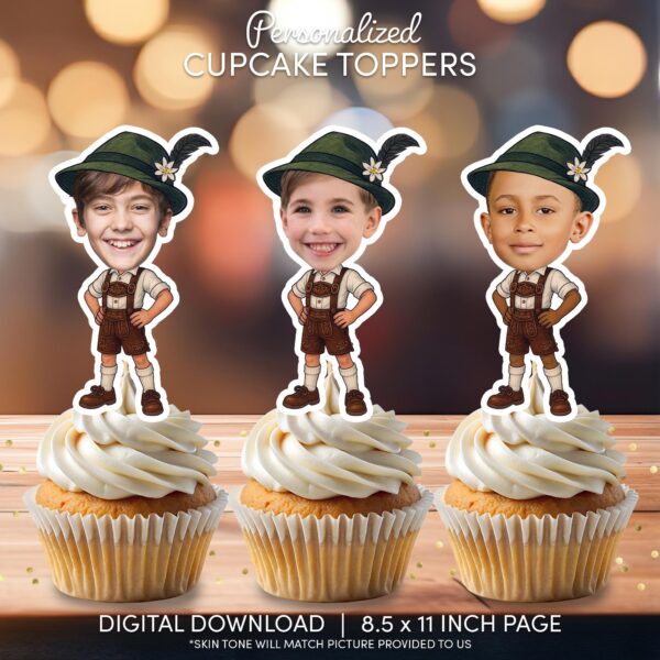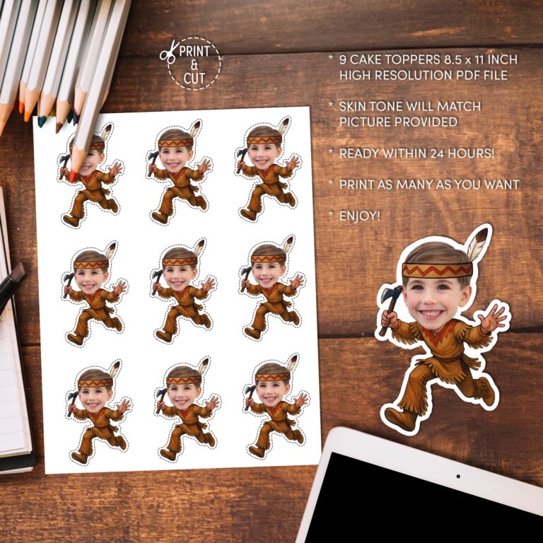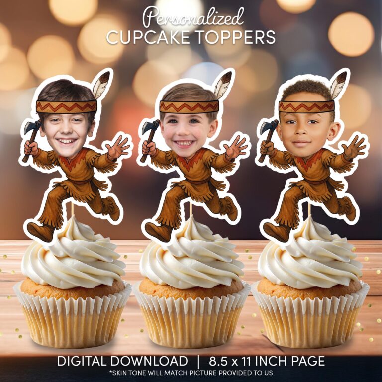 Add a spirited and personal touch to your celebration with these custom face cupcake toppers featuring a playful tribal costume design. This digital download allows you to feature your child's smiling face on an illustrated body wearing a fringed outfit, moccasins, and a feather headband while holding a small axe. Ideally suited for young children, these personalized decorations work perfectly for "Wild One" birthdays, Thanksgiving gatherings, or woodland-themed events. The design includes skin tone matching based on the photo you provide to ensure a cohesive look. Simply print, cut, and assemble at home to create a unique conversation starter for your dessert table.