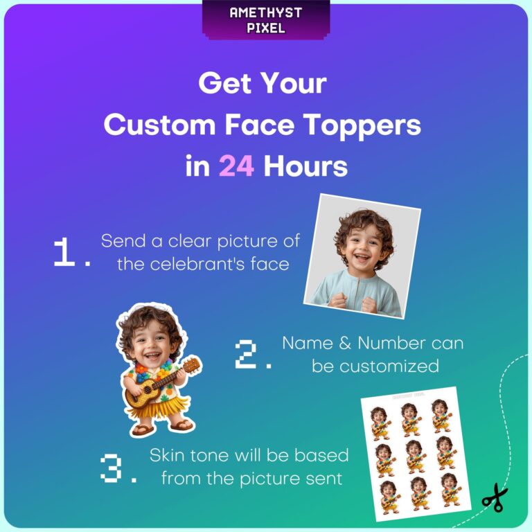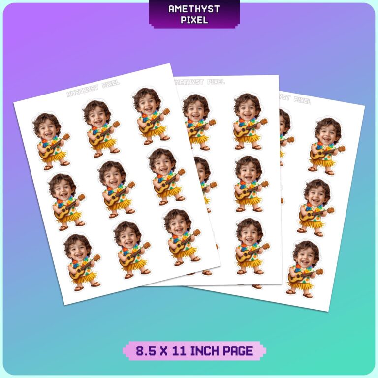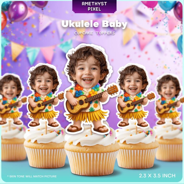 Bring the rhythm of the islands to your dessert table with these adorable Custom Face Ukulele Baby Cupcake Toppers. Designed specifically for toddlers and babies, this vibrant printable decoration transforms your child’s photo into a cheerful musician ready for a tropical celebration. The detailed design features a joyful body wearing a classic pineapple-print aloha shirt, a traditional grass skirt, and a colorful flower lei while strumming a wooden ukulele. Perfectly sized at 2.3 x 3.5 inches, these toppers are an ideal match for 'Aloha One' first birthdays, summer beach parties, or musical-themed baby showers. By combining high-quality digital imagery with easy DIY assembly, you can create a professional-looking, personalized centerpiece that captures the festive spirit of your special event.