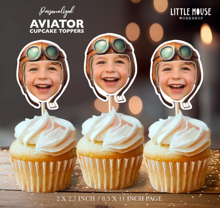 Custom Face Vintage Aviator Cupcake Toppers for Airplane Theme Birthday Parties