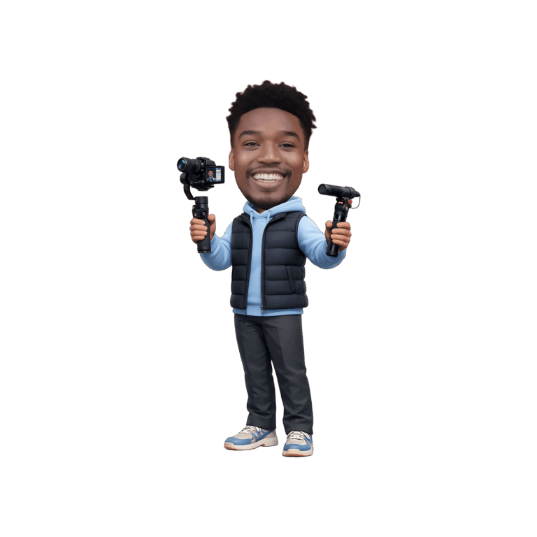 Celebrate your favorite aspiring filmmaker or social media star with these custom face content creator cupcake toppers. Designed for teens and adults who love vlogging, this unique digital design features a casual body wearing a black puffer vest and blue hoodie, fully equipped with a camera gimbal stabilizer and a handheld shotgun microphone. Simply provide a clear photo, and we will digitally integrate the face onto the character, creating a printable file ready for your event. These toppers are perfect for adding a personalized touch to a video production-themed birthday or a channel launch party, ensuring the guest of honor takes center stage on the dessert table.