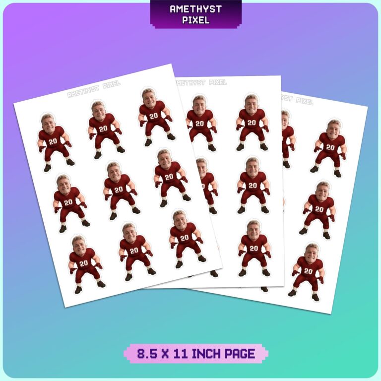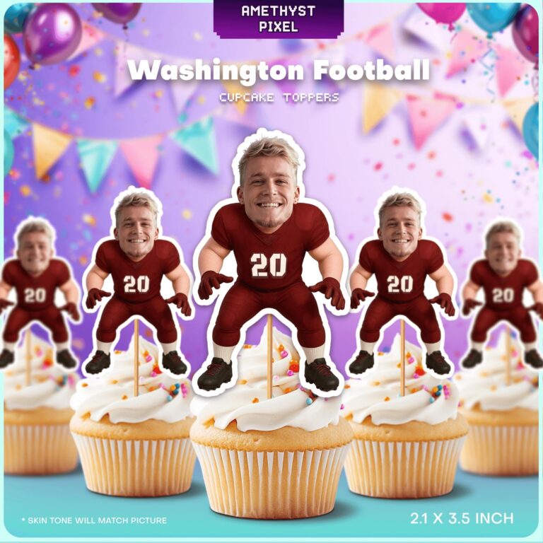 Score a touchdown at your next event with these dynamic Custom Face Washington Football Cupcake Toppers, the ultimate accessory for the gridiron enthusiast in your life. Designed to capture the intensity of game day, this printable design features a muscular player body clad in a classic burgundy and white uniform, crouched in an athletic stance ready for action. Whether you are celebrating an adult birthday, hosting a fantasy football draft, or organizing a spirited tailgate, these personalized decorations turn the guest of honor into the MVP of the dessert table. The high-resolution imagery ensures that once you attach your custom photo, the result is a seamless, professional-looking cake pick that sparks laughter and team spirit among guests. Ideal for sports-themed parties, these DIY toppers offer a creative way to showcase fandom while adding a unique, humorous element to your cupcakes.