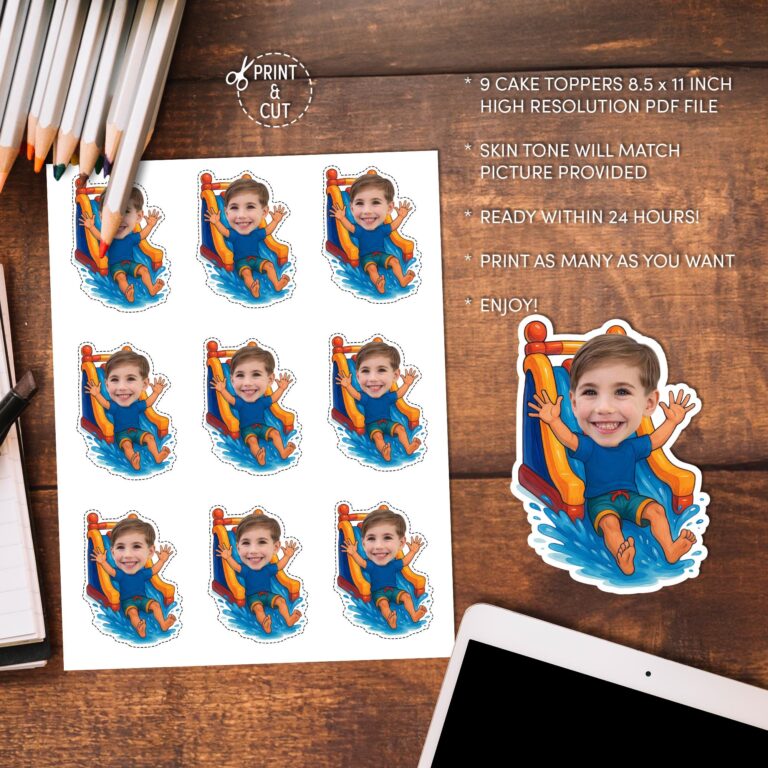 Make a huge splash at your child's next celebration with these personalized water slide cupcake toppers. Designed for fun-loving kids and vibrant summer events, this digital download transforms your guest of honor into a cartoon swimmer sliding right into a refreshing splash of water. The design features a colorful blue and orange slide, swim trunks, and an energetic water impact that looks fantastic on dessert tables. We actively match the skin tone of the cartoon body to the photo you provide, ensuring a seamless and personalized look for your pool party theme. Simply print these files at home on heavy paper, cut them out, and watch them become the highlight of your water park or backyard birthday bash.