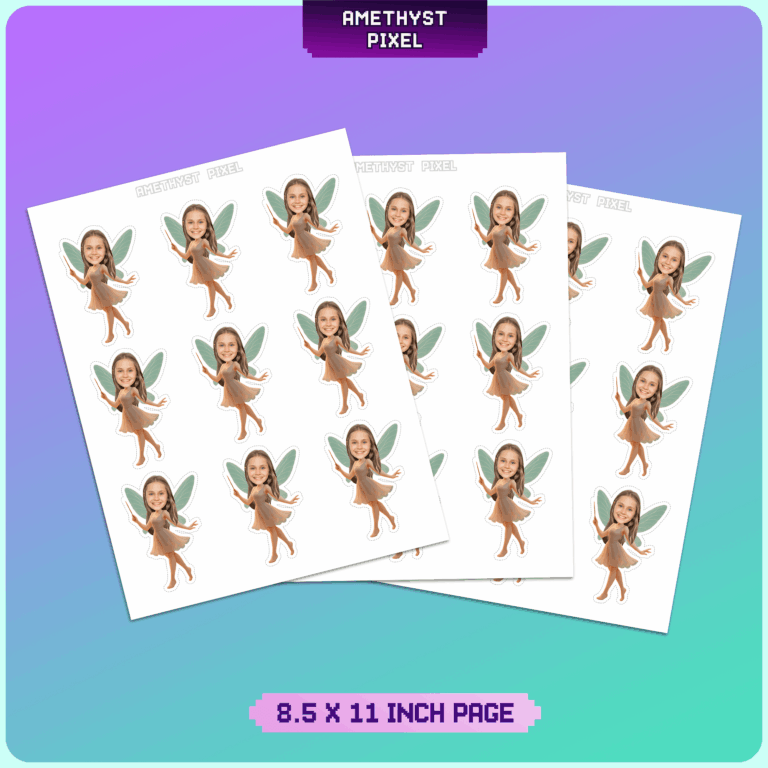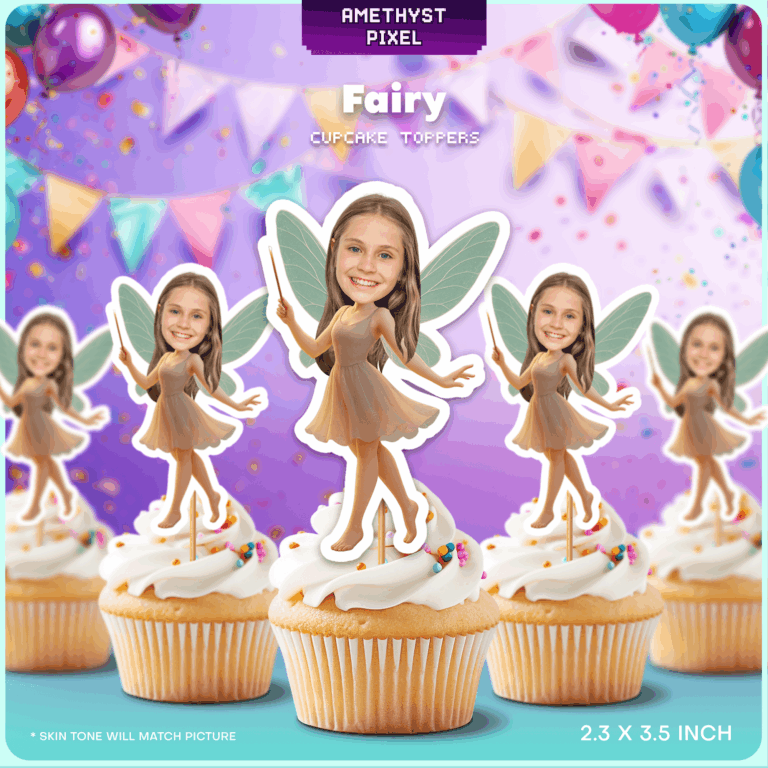 Transform your little birthday star into a whimsical sprite with these custom face fairy cupcake toppers. Ideally suited for young girls and pre-teens (ages 3–10), this delightful design features a graceful fairy pose complete with delicate translucent wings, a dancing stance, and a magic wand in hand. The neutral beige dress pairs beautifully with any pastel or enchanted garden party color scheme. Upon purchase, your provided photo is professionally edited onto the fairy body to create a high-resolution digital file. These printable decorations are designed with a convenient white border, making it easy to cut around the intricate wing details after printing on sturdy paper.