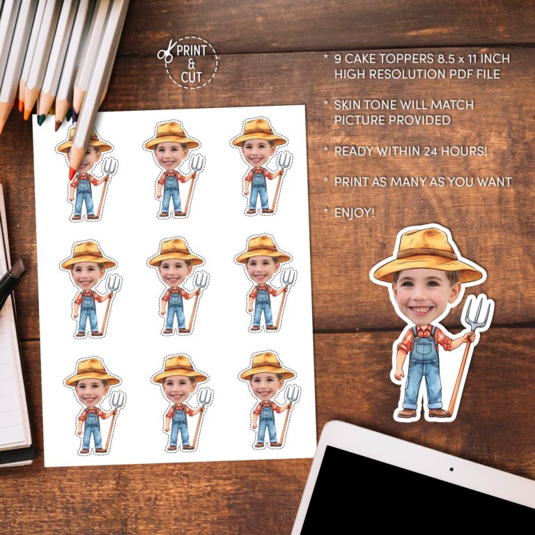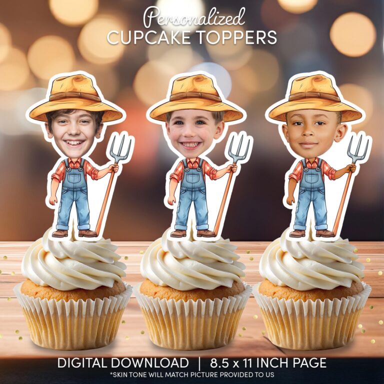 Bring the fun of the farm to your dessert table with these adorable custom face farmer cupcake toppers. Designed primarily for toddlers and young children celebrating a "Barnyard Bash" or "First Rodeo," this digital download transforms your child's photo into a cheerful farmer wearing denim overalls, a straw hat, and holding a pitchfork. A unique feature of this design is that the cartoon body's skin tone is adjusted to match the photo provided, ensuring a natural and cohesive look for every child. You will receive a high-quality printable file that allows you to print as many toppers as you need right from home. For the best results, use a high-resolution, front-facing photo and print on sturdy paper to keep the pitchfork and hat standing tall.