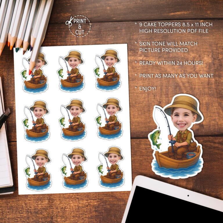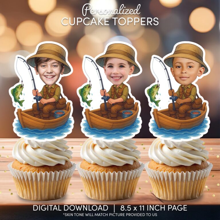 Make a splash at your little angler's celebration with these adorable custom face fishing cupcake toppers. Designed primarily for "The Big One" or "O-fish-ally" aged birthdays, this digital download features a charming illustration of a fisherman sitting in a wooden boat, excitedly reeling in a green fish catch. The design is personalized with your child's smiling face, creating a hilarious and memorable centerpiece for your dessert table. We ensure the illustrated skin tone on the character's hands and neck complements the photo provided for a cohesive look. Since this is a print-at-home file, you get full control over the paper qualityâwe recommend bright white cardstock to make the colors popâand can print as many toppers as your guest list requires.