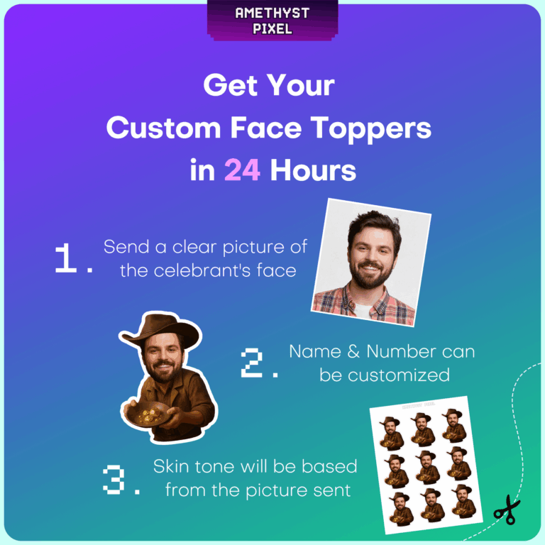 Bring the thrill of the Gold Rush to your dessert table with these hilarious custom face prospector cupcake toppers. Perfect for a Wild West theme or celebrating someone's "Golden Years," this design features your guest of honor's photo superimposed onto a rugged miner's body, complete with a wide-brimmed hat and a pan full of shimmering gold nuggets. Whether you are planning a retirement party for an adult or a historical western birthday for a child, these digital downloads add a personalized touch that guests love. Once you receive your high-resolution file, simply print on heavy cardstock and cut around the outline for a sturdy, professional finish that stands out in photos.