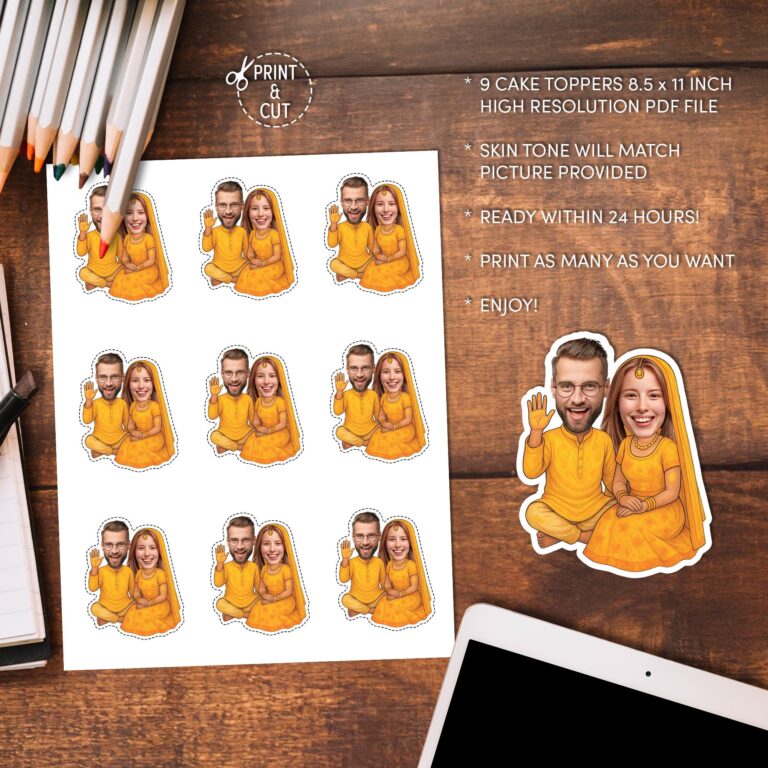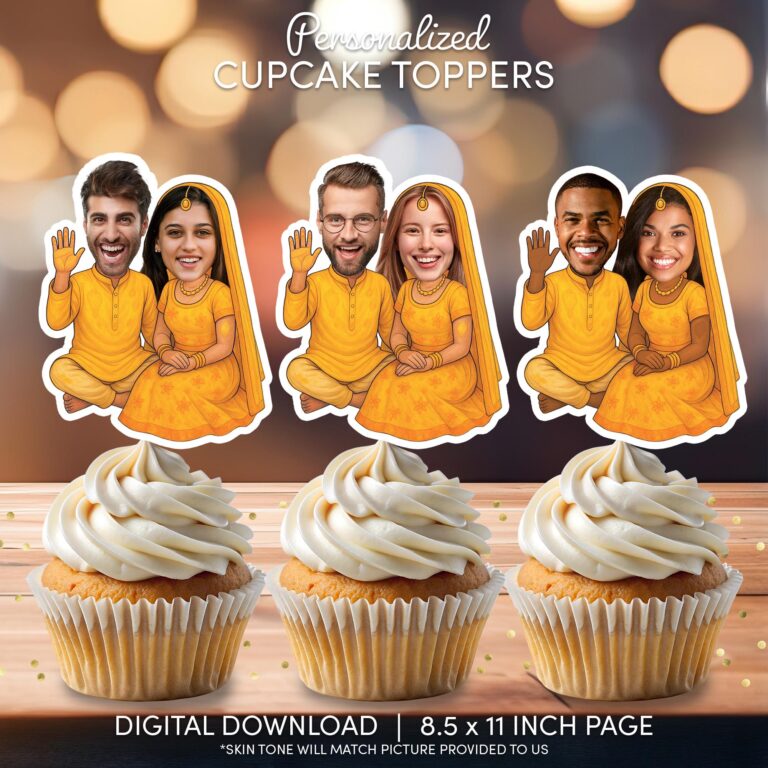 Add a vibrant and personalized touch to your pre-wedding festivities with these custom Indian wedding cupcake toppers, specifically styled for a Haldi ceremony. The design features a joyful bride and groom seated in traditional yellow and orange attire, perfectly complementing the marigold and turmeric themes of the event. Upon purchase, simply provide photos of the couple to receive a high-resolution digital file where their faces are seamlessly blended onto the illustrated bodies. These printable decorations are best suited for adult couples celebrating their engagement, Sangeet, or Haldi. I recommend printing these on heavy white cardstock for durability, creating a fun conversation piece for your dessert table or savory appetizer spread.