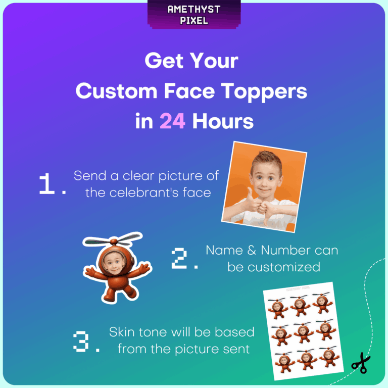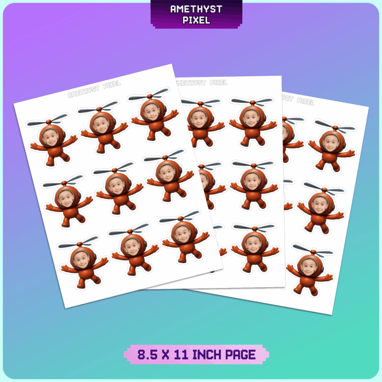 Transform your little one into an adorable high-flying aviator with these custom face Helicopter Buddy cupcake toppers. Perfect for toddlers and young children who are fascinated by things that fly, this whimsical design features a playful brown helicopter suit complete with rotor blades on the helmet. You provide a clear photo of the birthday boy or girl, and we incorporate their face into the cockpit for a hilarious and personalized touch. Ideal for aviation, transportation, or just-for-fun themes, these printable decorations are designed with a smooth white outline to make cutting them out with scissors hassle-free. Upon purchase, you receive a high-resolution digital file ready for unlimited printing at home.