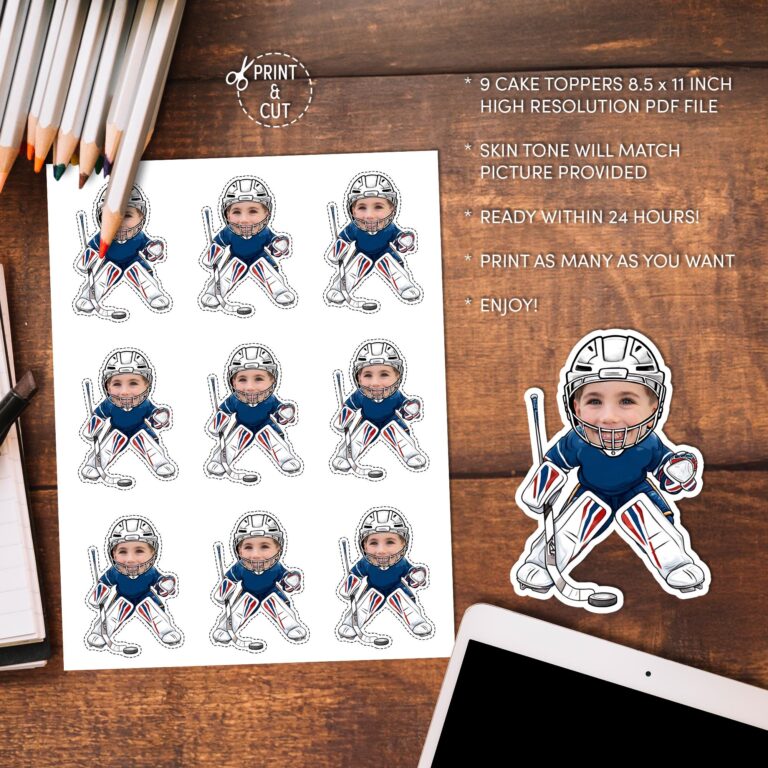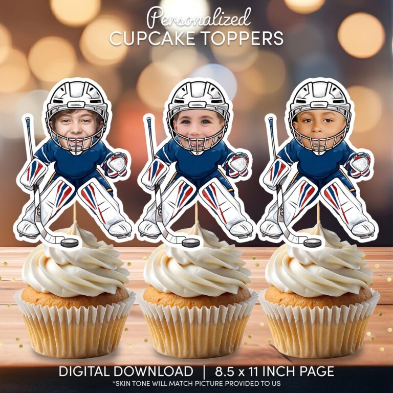 Score a winning goal at your next event with these personalized hockey goalie cupcake toppers, designed to turn the guest of honor into the star player. Perfect for children โs sports-themed birthdays or team celebrations, this digital download features a detailed cartoon goaltender body complete with pads, stick, and puck. We customize the design by placing your provided photo inside the helmet cage and matching the cartoon skin tone to your picture for a seamless look. These printable decorations add high-energy fun to any dessert table. Once you receive your file, simply print on quality paper, cut out the goalies, and assemble them for a unique party highlight that celebrates your favorite little athlete.