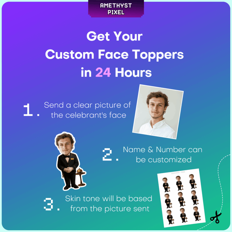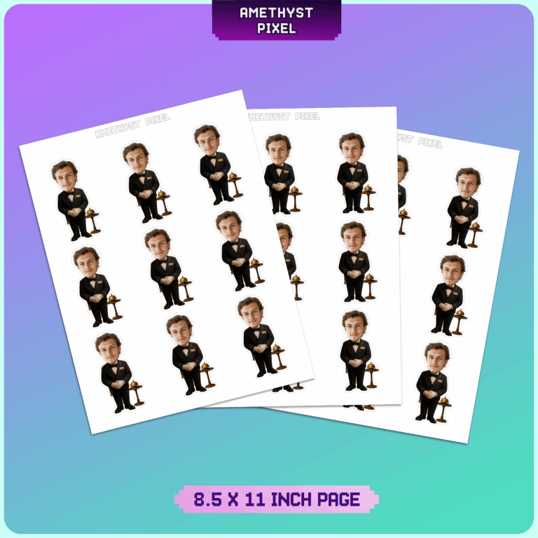 Welcome guests to your event with five-star flair using these custom hotel concierge cupcake toppers. This printable design transforms your guest of honor into a professional concierge, featuring a sharp black uniform with gold trim, a bow tie, white gloves, and a classic service bell stand. Ideally suited for adult birthday parties, hospitality staff retirements, or "Grand Hotel" style movie nights, this digital download adds a sophisticated yet humorous touch to your dessert table. After providing your photo, you will receive a high-quality file designed for easy printing at home, ensuring the skin tone matches seamlessly for a realistic look.