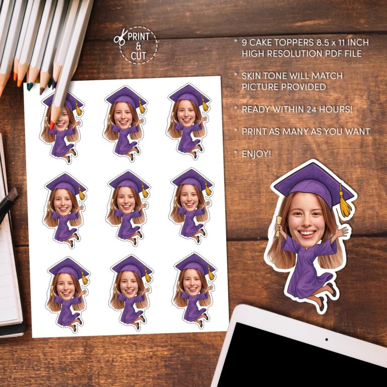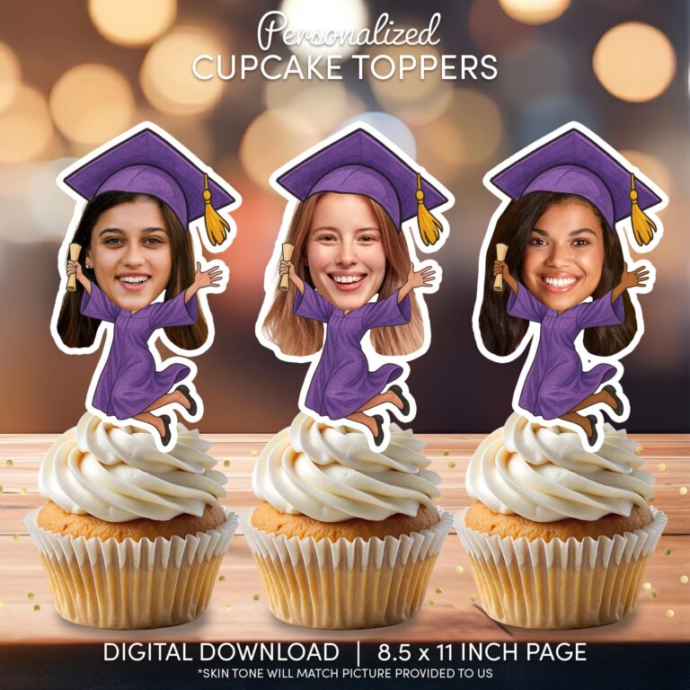 Celebrate your graduate's incredible achievement with these fun and personalized jumping graduate cupcake toppers. Featuring a spirited illustration of a graduate in a classic purple cap and gown holding a diploma, these custom decorations add a joyful, personal touch to any dessert table. Simply provide a photo, and the design is customized to feature your graduate's face, with the illustrated skin tone matched to their complexion for a seamless look. Perfect for high school, college, or university celebrations, these digital printables turn standard cupcakes into a conversation starter. As a digital download, this offers a convenient, instant solution for adding high-quality, themed decor to your graduation open house or dinner party without waiting for shipping.
