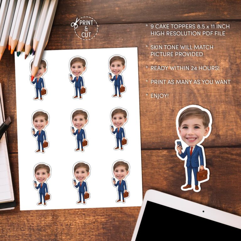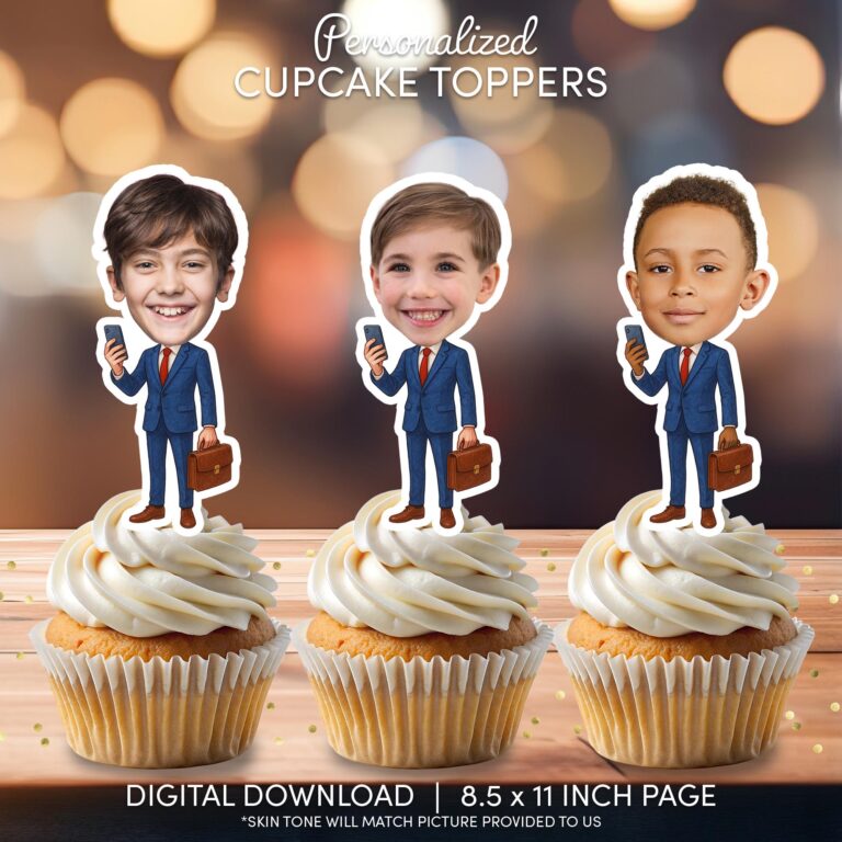 Transform your dessert table into a corporate headquarters with these adorable custom face cupcake toppers, perfect for a "Little Boss" or business-themed birthday bash. This digital download features a sharp cartoon body wearing a classic blue suit and red tie, accessorized with a smartphone and legal briefcase. We personalize the design by expertly placing your child's photo on the body, ensuring the hand skin tone matches the picture provided for a seamless look. Ideally suited for first birthdays, toddler parties, or even funny promotion celebrations for adults, these printable decorations are a guaranteed crowd-pleaser. You receive a high-resolution file ready to print at home, making it easy to create memorable, professional-looking treats.