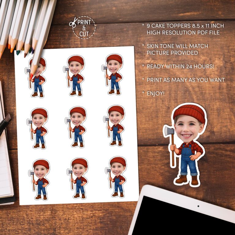 Bring a rustic, outdoorsy vibe to your dessert table with these adorable custom lumberjack cupcake toppers. Perfect for a "Wild One" first birthday, camping theme, or woodland celebration, this digital design transforms your child's photo into a rugged little woodsman. The character features a classic red buffalo plaid shirt, denim overalls, durable work boots, and a cozy red knit beanie, all while holding a playful axe prop. We professionally edit your submitted photo to match the skin tone of the cartoon body, ensuring a cohesive and high-quality look. You will receive a high-resolution printable file that allows you to print as many as you need at home, making it easy to add a personalized, funny touch to your party decor.