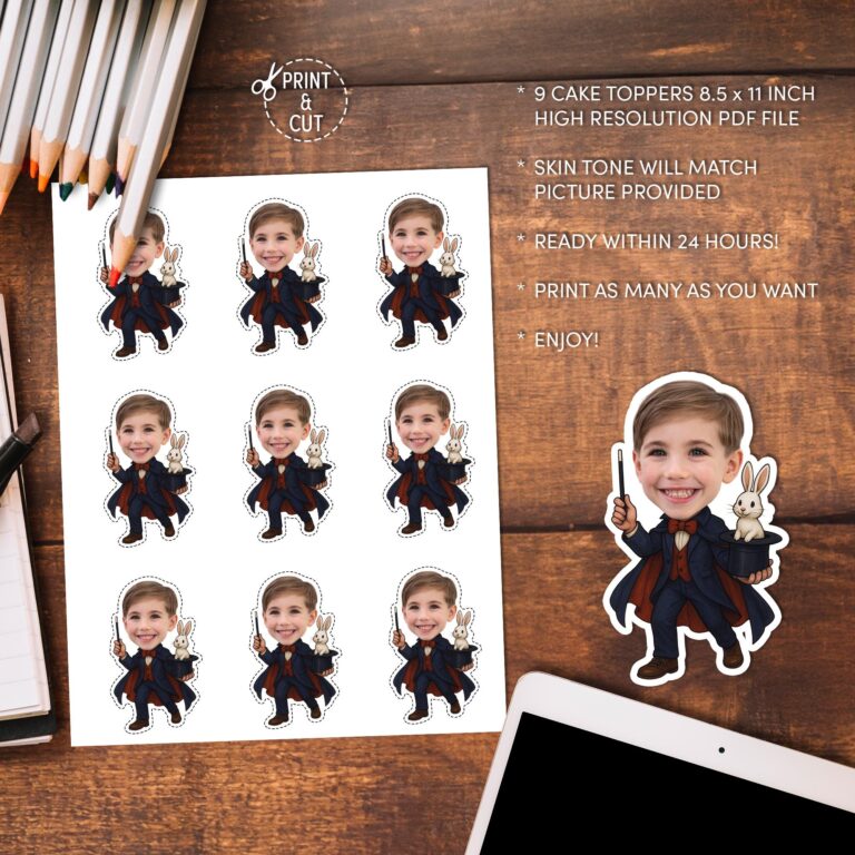 Transform your child into the star of the show with these enchanting custom magician cupcake toppers. Perfect for a magic-themed birthday party, this design features your provided photo seamlessly superimposed onto a classic illusionist body, complete with a tuxedo, flowing cape, magic wand, and a cute rabbit popping out of a top hat. The cartoon body's skin tone is adjusted to match your photo, ensuring a natural and personalized look for the birthday boy or girl. Delivered as a high-resolution digital file, these toppers are designed for easy DIY preparation at home. Simply print on quality paper and cut them out to create a truly magical dessert display that guests of all ages will love.