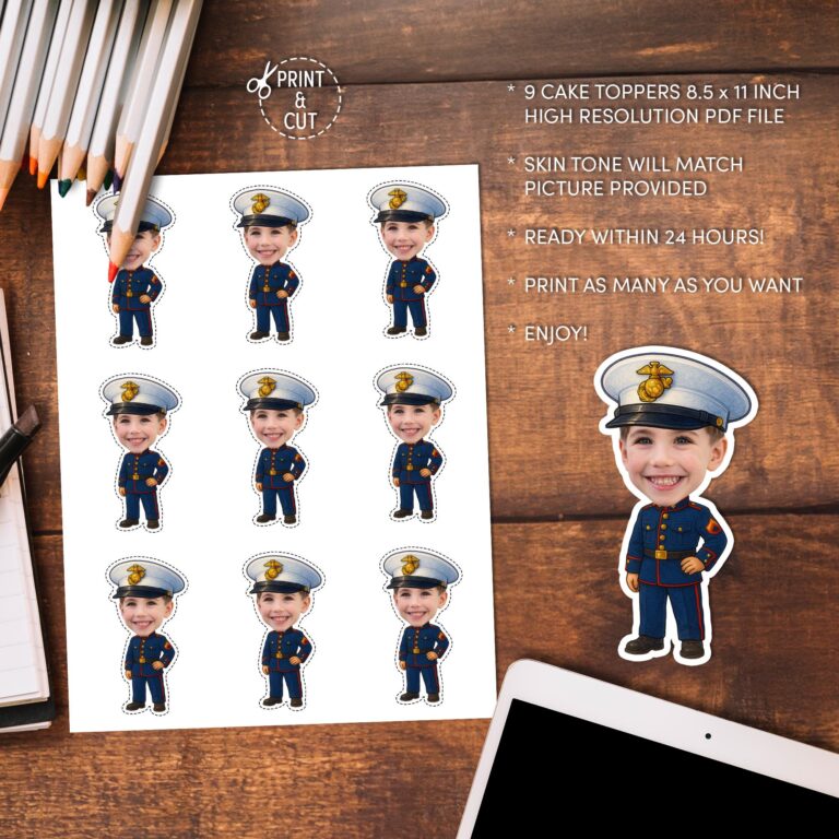 Transform your party desserts into a salute-worthy tribute with these printable Marine-style soldier cupcake toppers. Featuring a classic dress blue military uniform body complete with a white peaked cap, gold buttons, and red piping, these custom photo decorations turn your guest of honor into a distinguished little hero. Ideal for children's birthday parties or celebrating a family member's service, simply provide a clear front-facing photo and we will crop the face to seamlessly fit the uniform design. This digital download allows you to print high-quality, personalized accents right from home, ensuring a fun and memorable addition to your celebration table.