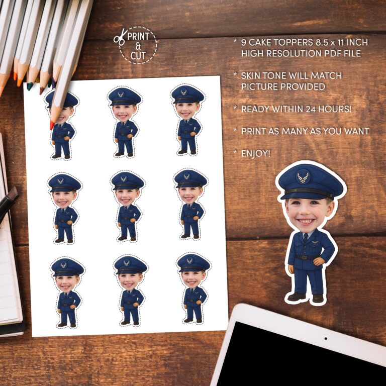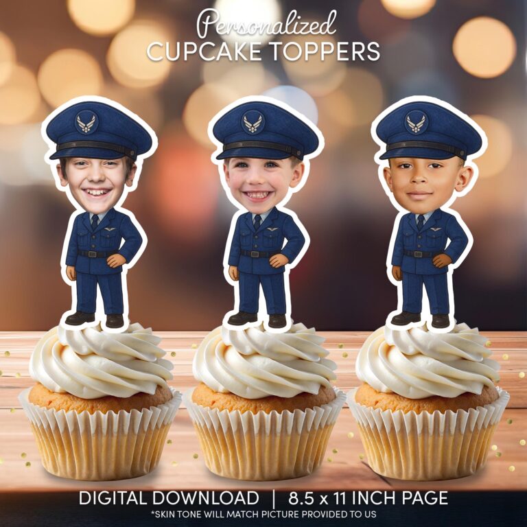 Celebrate your favorite aviator or service member with these personalized military pilot cupcake toppers featuring their unique face. Designed with a sharp, dark blue dress uniform and a classic peaked service cap, this digital download is an excellent choice for military families, "future pilot" children's birthdays, or retirement celebrations. Upon purchase, your provided photo is carefully edited onto the cartoon body, with the skin tone of the hands and neck adjusted to match the picture for a seamless look. delivered as a high-resolution file, these printable toppers allow you to create unlimited decorations right from home, ensuring your dessert table looks perfectly coordinated for the big event.