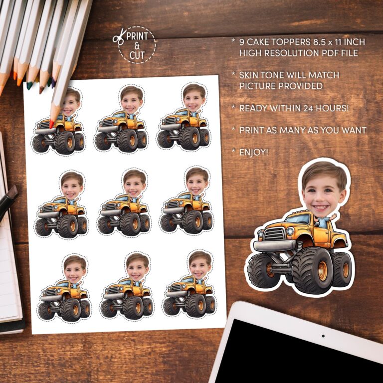 Rev up the excitement at your next event with these custom monster truck cupcake toppers, designed to put your birthday child right in the driver's seat. Perfect for vehicle-loving kids, this printable party decoration features a rugged orange off-road truck with massive tires, where your child's smiling face is edited onto the cartoon driver's body. Delivered as a high-resolution digital file, these toppers are ideal for print-at-home projects, allowing you to create as many decorations as you need for the guest list. Whether you are hosting a "Two Fast" celebration or a muddy monster jam bash, these photo-personalized accents add a hilarious and memorable touch to your dessert table. For the best visual impact, we recommend using a bright, close-up photo of your child to ensure their expression pops against the vibrant truck design.