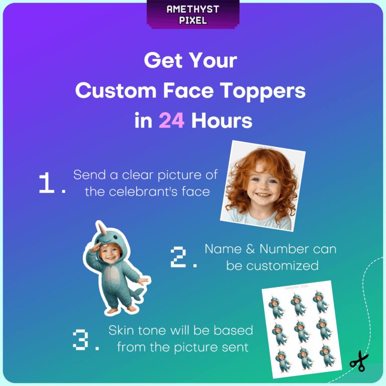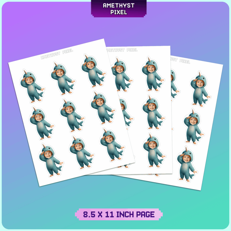 Dive into a whimsical celebration with these adorable custom face narwhal cupcake toppers, perfect for adding a splash of fun to any under-the-sea event. Designed primarily for babies, toddlers, and young children, this digital download transforms your little one's photo into a cute blue narwhal character, complete with a signature tusk and fins. The design features a charming, chubby costume style that looks wonderful on birthday treats. As a printable file, this allows you to print as many copies as you need from home, ensuring your dessert table is fully stocked with personalized "unicorn of the sea" decorations. Simply upload a clear, front-facing photo to get started on creating a memorable DIY party accent.