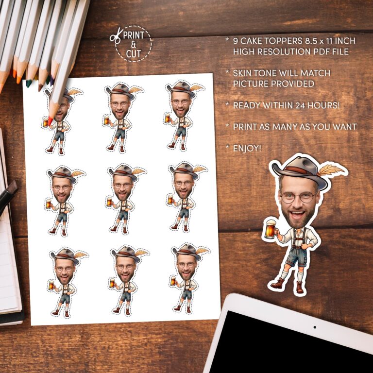 Bring the lively spirit of Munich directly to your dessert table with these hilarious custom face cupcake toppers featuring a traditional German Oktoberfest design. Perfect for adults, these digital decorations showcase the guest of honor's photo on a caricature body wearing authentic Lederhosen, a Tyrolean hat, and holding a frothy beer mug. Whether you are planning a 30th birthday, a bachelor party, or a seasonal fall festival, these printable toppers add a personal and comedic touch that guests love. The digital file is designed for high-resolution printing at home, ensuring the colors pop on bright white cardstock. We adjust the skin tone of the illustrated body to best match the photo you provide, creating a seamless and professional look for your DIY party decor.