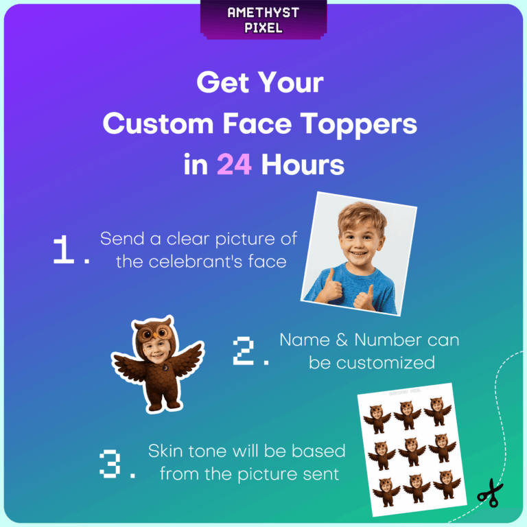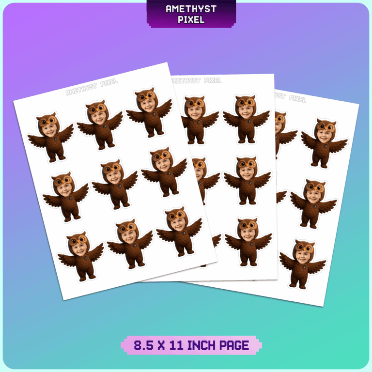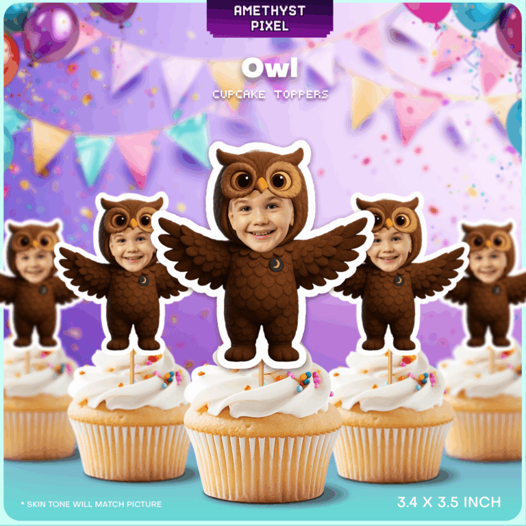 Transform your party into a whimsical forest adventure with these custom owl cupcake toppers featuring your child's face. Perfectly suited for toddler birthdays and woodland-themed events, this personalized design edits your provided photo into a detailed brown owl costume, complete with spread wings, textured feathers, and an adorable hooded face. The high-resolution digital file is designed for easy at-home printing, allowing you to create as many toppers as you need for your dessert table. Each topper features a clean white outline to simplify the cutting process, ensuring a professional look even for DIY beginners. Whether you are hosting a "Whoo's Turning One" celebration or a forest animal baby shower, these unique decorations add a heartwarming and funny personal touch to your cupcakes.