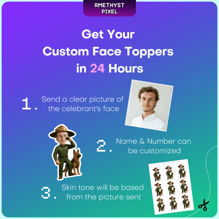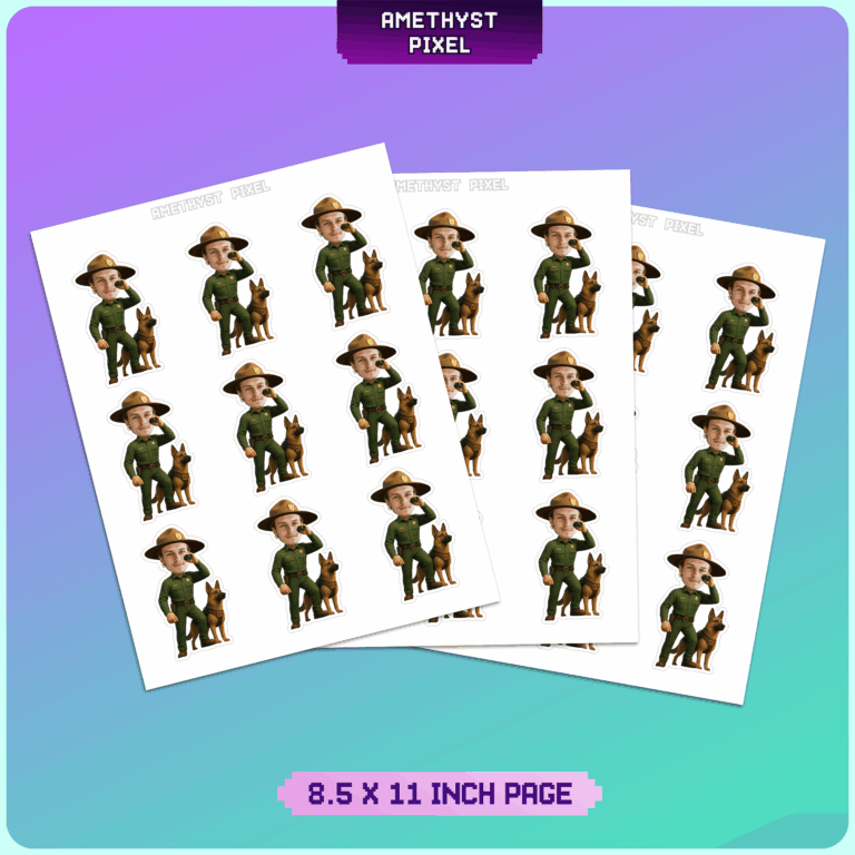Transform your guest of honor into a wilderness hero with these custom park ranger cupcake toppers. This adventurous design features a classic forest green ranger uniform, a wide-brimmed campaign hat, and a pair of binoculars held ready for spotting wildlife. Standing loyally beside the ranger is a detailed German Shepherd K9 companion, making this the perfect decoration for nature lovers and outdoor enthusiasts. Whether celebrating a child's camping-themed birthday or a park officer's retirement, these personalized toppers add a unique touch to your dessert table. You will receive a high-resolution digital file ready for home printing, ensuring you can produce as many toppers as you need for your event.