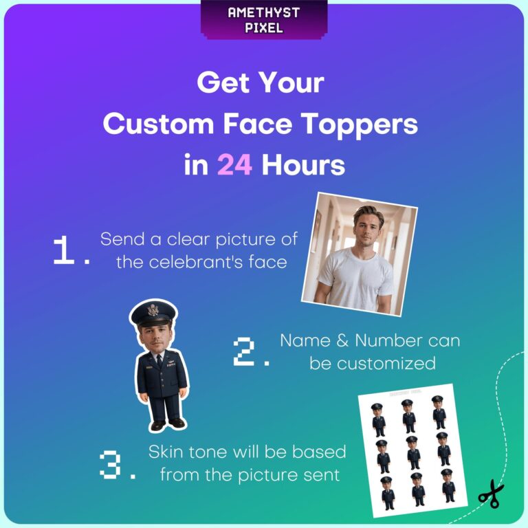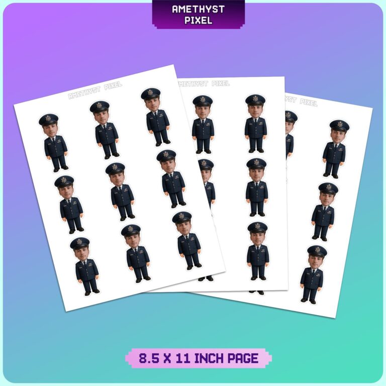 Honor the service of your favorite airman with these digitally crafted Air Force Officer cupcake toppers, specifically designed for adults celebrating significant career milestones. The design features a sharp, dark blue service dress uniform complete with a peaked service cap, a detailed ribbon rack, and silver pilot wings insignia, ensuring an authentic look for your military-themed event. Whether you are organizing a commissioning ceremony, a wing pinning celebration, or a welcome home party after deployment, these personalized photo decorations add a respectful yet festive touch to the dessert table. Each topper stands approximately 3.7 inches tall, making them the ideal size for standard cupcakes, muffins, or savory party treats.