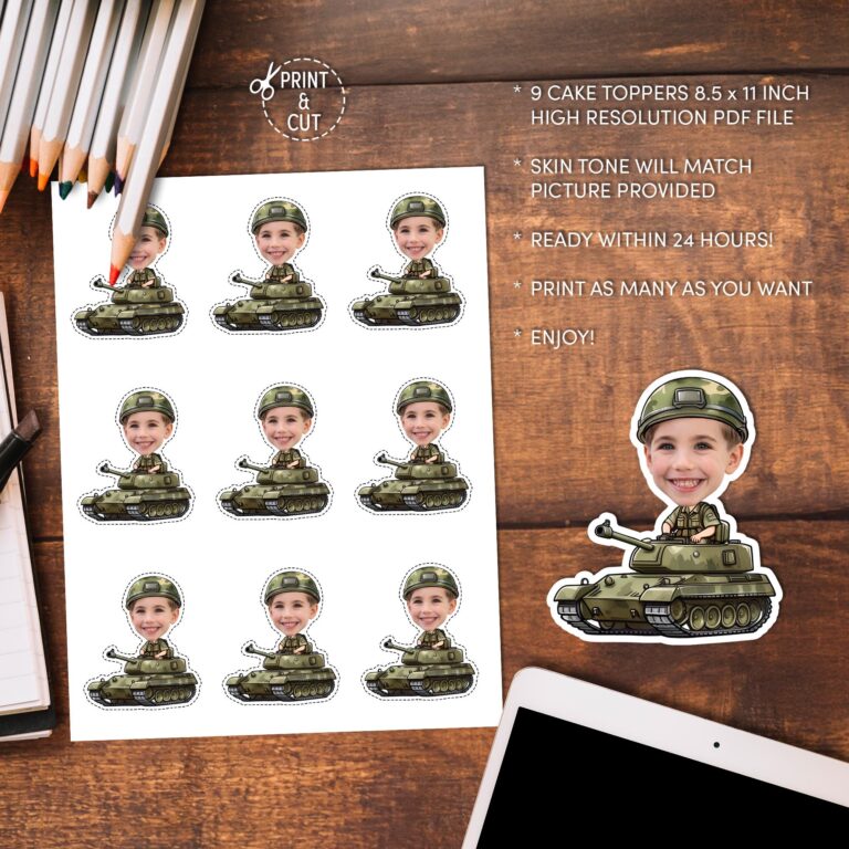 Deploy a fun and memorable addition to your next celebration with these personalized army tank cupcake toppers. Specifically designed for military or vehicle-themed birthday parties, this digital design features a sturdy green cartoon tank led by a soldier body that is customized with your child's face. We carefully edit the character's skin tone to match the photo provided, ensuring a cohesive and high-quality look for your party decor. Delivered as a printable digital file, these toppers create an exciting focal point on your dessert table. They are perfect for young children who love action and adventure themes, transforming standard cupcakes into a fleet of personalized tanks.