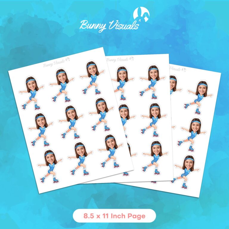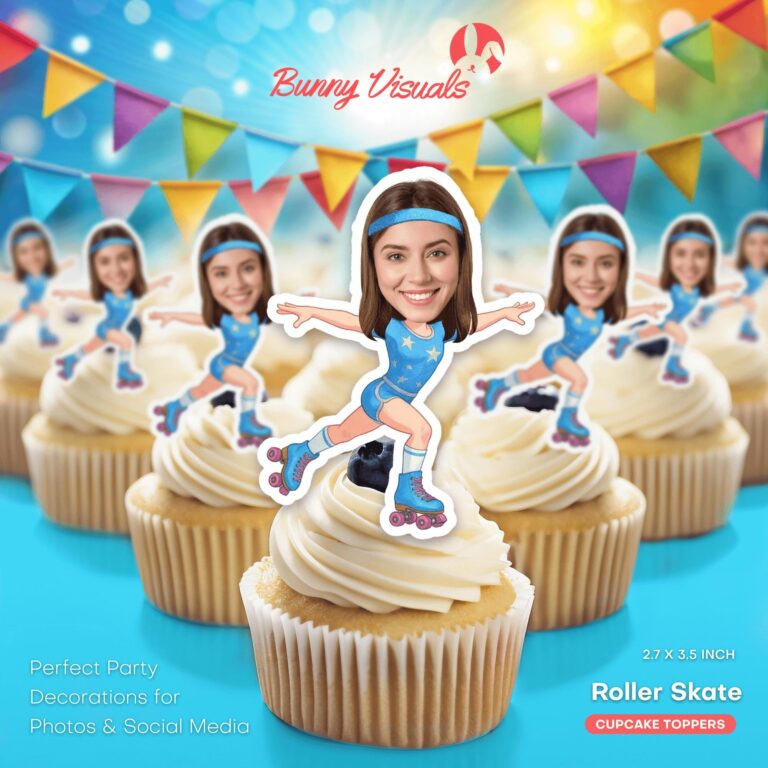 Bring the groovy vibes of the skating rink to your dessert table with these specialized custom face cupcake toppers. Perfect for a roller disco birthday or an 80s-themed celebration, this design features a spirited cartoon body clad in a blue star-patterned leotard, matching sweatband, and vintage quad skates with pink wheels. Whether you are celebrating a teen's birthday or planning a nostalgic event for an adult, these printable decorations transform standard cupcakes into hilarious, personalized centerpieces. The integration of a real photo creates a unique visual that highlights the guest of honor's personality, ensuring your party refreshments stand out both in person and on social media.
