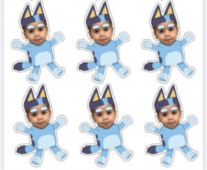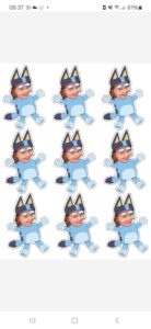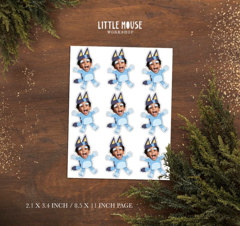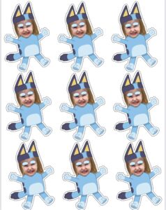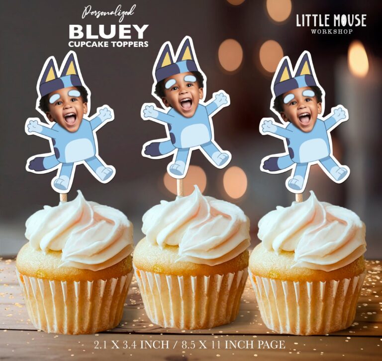 Transform your little one's dessert table into an imaginative play zone with these personalized Bluey cupcake toppers, designed specifically for toddlers and preschoolers who adore the famous Heeler family. Each printable topper features your child’s smiling face expertly superimposed onto an energetic, jumping Bluey body, capturing the excitement of their special day. Sized perfectly at approximately 2.1 by 3.4 inches, these high-resolution decorations are formatted for easy printing on standard 8.5 x 11-inch cardstock. Whether you are hosting a second birthday or a lively preschool gathering, these custom photo decorations add a hilarious and heartwarming touch to store-bought or homemade cupcakes. The vibrant light and dark blue colors coordinate seamlessly with other Blue Heeler party supplies, ensuring your dessert display looks professionally styled while highlighting the birthday star.