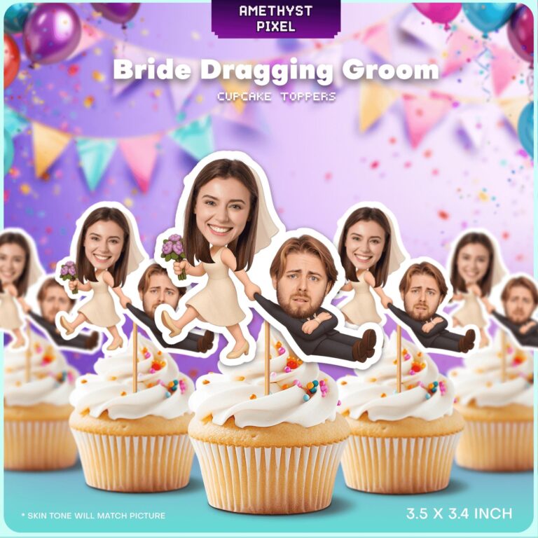 Inject a dose of humor into your wedding celebrations with these custom face cupcake toppers depicting a cheerful bride dragging a hesitant groom. Specifically designed for adult engagement parties, bridal showers, or bachelor weekends, this playful decoration captures the comedic 'game over' sentiment perfectly. The design features a cartoon body of a bride in a white gown and veil physically pulling a suited groom by his ankle across the ground, creating a hilarious visual contrast between her excitement and his reluctance. We expertly integrate your uploaded photos onto these figures, ensuring the skin tone matches your pictures for a realistic yet whimsical finish. These printable toppers serve as excellent conversation starters at rehearsal dinners or as unique accents for a groom’s cake, proving that wedding planning doesn't always have to be serious.